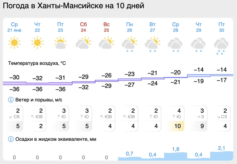 Ранее в Югре уже отмечались затяжные сильные морозы: в конце декабря окружной Гидрометцентр предупреждал о похолодании до -40 градусов, а в Ханты-Мансийске температура опускалась до -25–35. Тогда в крупнейших городах округа — Сургуте, Нижневартовске и Нефтеюганске — также фиксировались ночные значения ниже -30 градусов.