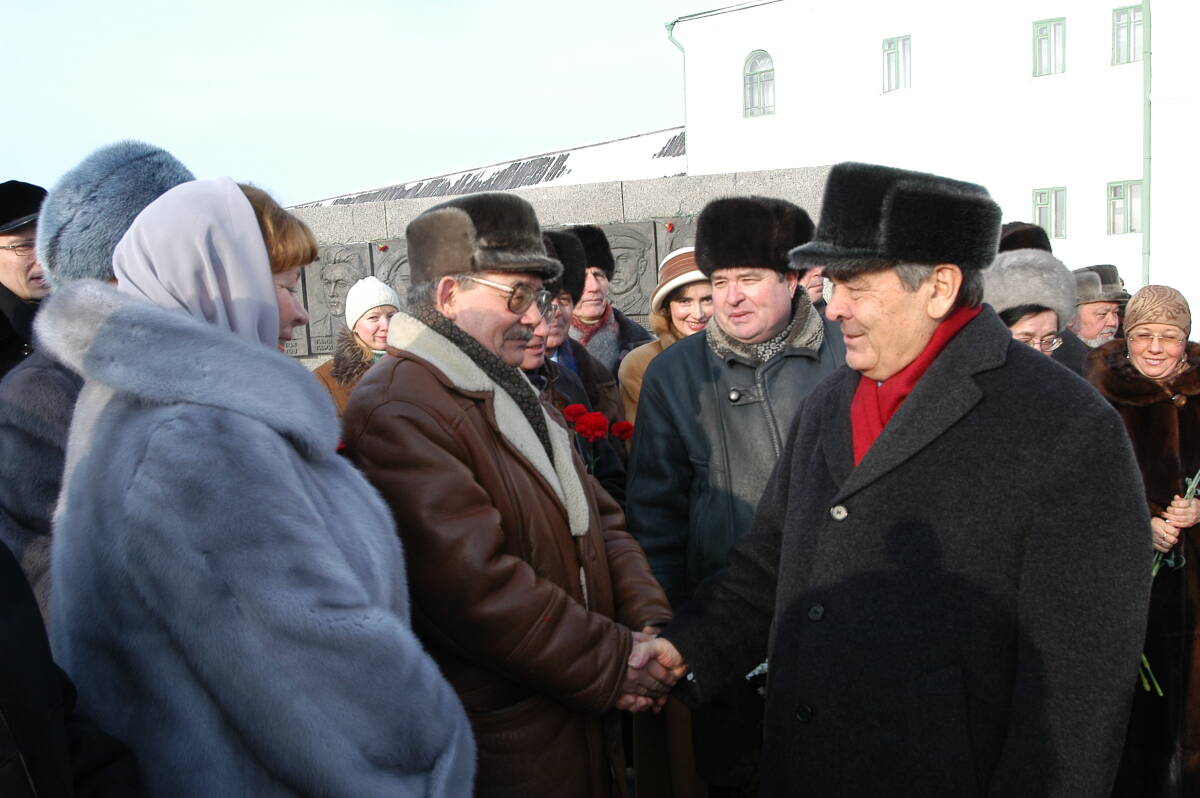 Минтимер Шаймиев и Туфан Миннуллин на торжественном мероприятии у памятника Мусе Джалилю в честь 100-летия со дня рождения поэта, 2006 год