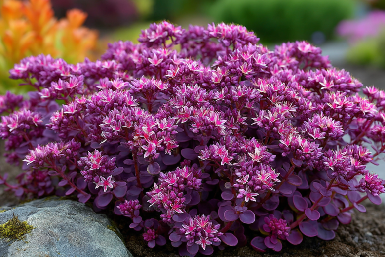 Седум «пурпуреум» — этот многолетник представляет собой низкорослое почвопокровное растение высотой 10–15 см, способное создавать на участке плотные яркие ковры из пурпурных листьев и розовых звездочек.