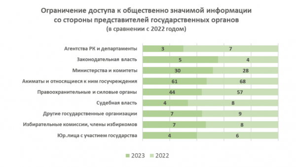 – С января по декабрь 2023 года журналисты столкнулись с рядом проблем в доступе к общественно значимой информации. Всего был зафиксирован 192 случай, когда наблюдались: непредоставление информации, нарушение сроков её предоставления или ограничение доступа к ней. В большинстве случаев (86% – 165 фактов из 192) ограничение доступа к информации исходило от представителей государственных, правоохранительных органов, – сообщает «Әділ сөз».