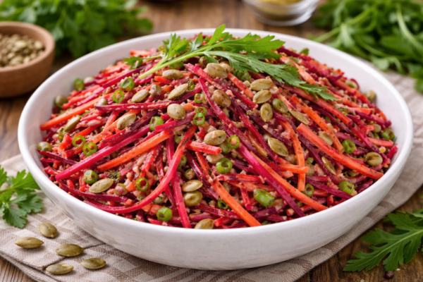 Ингредиенты: кабачок — 100 г, свекла — 100 г, морковь — 100 г, оливковое масло — 50 г, арахисовая паста без сахара — 30 г, сок одного лимона, петрушка — 10 г, зелёный лук — по вкусу, соль и перец — по вкусу, тыквенные семечки — по вкусу, руккола — немного для подачи.