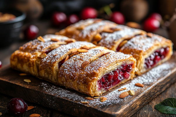 Замороженную вишню не размораживаю полностью — слегка оттаявшие ягоды лучше держат форму. Смешиваю вишню с сахаром и кукурузным крахмалом. Крахмал нужен, чтобы сок от ягод не вытек и не подгорел. Слоеное тесто раскатываю в пласт толщиной около 4 мм и нарезаю на квадраты или круги. На каждую заготовку выкладываю вишневую начинку (примерно 1 ст. л.). Края теста защипываю, формируя аккуратные пирожки. Выкладываю их на противень с пергаментом. Желток взбиваю с чайной ложкой воды и смазываю им пирожки — это даст красивый золотистый цвет. Сверху посыпаю миндальными лепестками. Выпекаю в разогретой до 180 °C духовке 20–25 минут до румяного оттенка. Даю пирожкам немного остыть на решетке и перед подачей обильно посыпаю сахарной пудрой через ситечко.